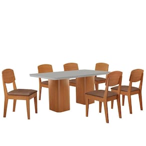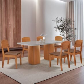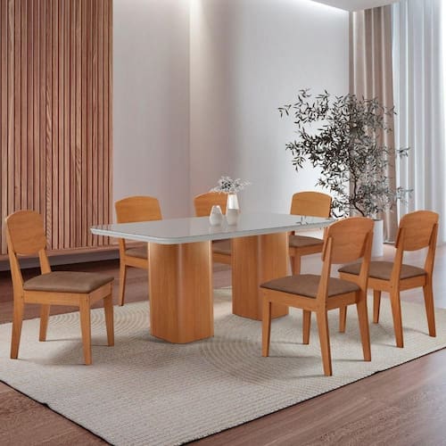 Mesa De Jantar Eloise 180cm Tampo Mdf 6 Cadeiras Moderna Tork /nat/off/serig. Off Conjunto Sala de Jantar Mesa Eloise e Cadeira Copper A Mesa Eloise e uma peca de design sofisticado, com tampo em MDF Vidro canto copo, que adiciona elegancia e modernidade ao ambiente. Seu grande destaque esta nas bases com formato de torres, que trazem um visual marcante. A Cadeira Copper combina design contemporaneo e conforto, com encosto em MDF moldado que oferece suporte ergonomico ideal. Seu estofado acolhedor garante um assento confortavel, enquanto o acabamento refinado e detalhes sofisticados valorizam seu visual, tornando-a perfeita para ambientes modernos e elegantes.