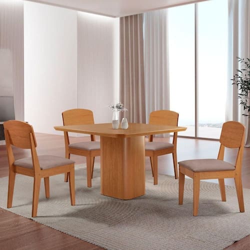 Mesa De Jantar Eloise 90cm Tampo Mdf 4 Cadeiras Copper Linho Capuccino/ Conjunto Sala de Jantar Mesa Eloise e Cadeira Copper A Mesa Eloise e uma peca de design sofisticado, com tampo em MDF canto copo, que adiciona elegancia e modernidade ao ambiente. Seu grande destaque esta nas bases com formato de torres, que trazem um visual marcante. A Cadeira Copper combina design contemporaneo e conforto, com encosto em MDF moldado que oferece suporte ergonomico ideal. Seu estofado acolhedor garante um assento confortavel, enquanto o acabamento refinado e detalhes sofisticados valorizam seu visual, tornando-a perfeita para ambientes modernos e elegantes.