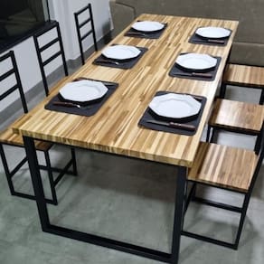 O estilo industrial desta mesa é evidente em sua estrutura robusta, destacando-se pelos materiais de alta qualidade e acabamento impecável. As pernas de metal resistente garantem estabilidade e durabilidade, enquanto o design minimalista confere um toque moderno e elegante ao conjunto.