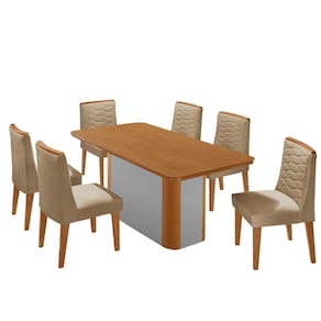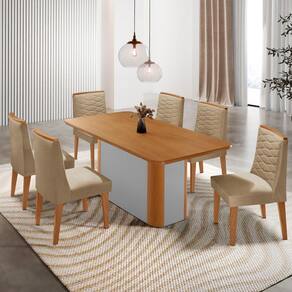 A mesa Isadora, com tampo laminado e canto copo, garante segurança e durabilidade, enquanto sua base deslumbrante, com detalhe especial na sua angulação arredondada Naturalle. As Cadeiras Eloise, totalmente estofadas e com delicados bordados, oferecem o máximo de conforto sem abrir mão do estilo. As alças trazem um visual moderno e diferenciado, complementando o conjunto com sofisticação.