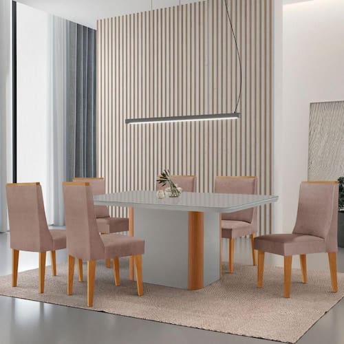 Mesa De Jantar Isadora 180cm Tampo Mdf Vidro Com 6 Cadeiras Lin Capuccino Off Serig Sala de Jantar Isadora com Cadeira Lisboa A mesa Isadora, com tampo Canto Copo e Vidro, garante seguranca e durabilidade, enquanto sua base deslumbrante, com detalhe especial na sua angulacao arredondada Naturalle, transforma este conjunto em uma verdadeira peca de destaque na sua sala de jantar!