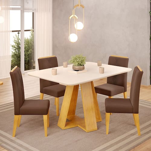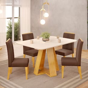 Mesa de Jantar Kiara 120x90 com 04 Cadeiras Yasmin Cedro Off White Veludo Moca DJ Móveis - Marrom