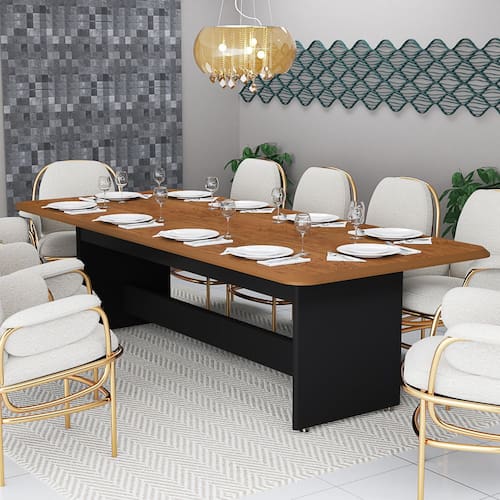 Transforme sua cozinha ou sala de jantar com esta Mesa Retangular de 8 Lugares, perfeita para reunir família e amigos com conforto e estilo. Com design moderno e elegante, a mesa combina tampo amadeirado em MDF de alta resistência com base na cor preta, criando um contraste sofisticado que valoriza qualquer ambiente. Além de funcional, ela é robusta, prática e fácil de limpar, ideal para o uso diário. Seja para refeições rápidas no dia a dia ou jantares especiais, esta mesa é a escolha ideal para quem busca beleza, durabilidade e praticidade. Características: · Modelo: Mesa retangular para cozinha/jantar · Capacidade: 8 lugares · Material: MDF de alta qualidade · Acabamento: Tampo amadeirado com base nature · Estilo: Moderno e elegante · Uso indicado: Cozinha, sala de jantar ou espaço gourmet · Durabilidade: Estrutura firme e de fácil manutenção Benefícios: Design moderno que combina com diferentes estilos de decoraçãoEspaço ideal para até 8 pessoasTampo resistente e de fácil limpezaExcelente opção para cozinha ou sala de jantar