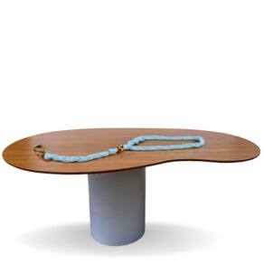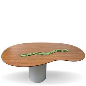 Essa mesa possui uma bases em formato cilindro, e acompanha um lindo tampo na cor freijo Melamina em formato orgânico.