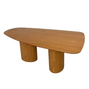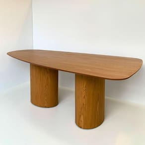 Essa mesa possui duas bases em formato cilindro oval, elas são revestidas em lamina de madeira e acompanha um lindo tampo na cor freijo em formato orgânico em MDF Melamina muito resistente e ideal para superfícies de apoio como tampo de mesa.