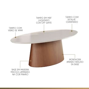 CARACTERÍSTICAS TÉCNICAS: - Base em Madeira Maciça Laminada na cor Pinhão - Tampo em MDF, Pintura Laca com Vidro na cor Off White - Tampo com Detalhe Chanfrado com 25 mm - Acabamento em Verniz Semi Brilho - Produto Entregue Semi Montado, apenas Fixação da Base