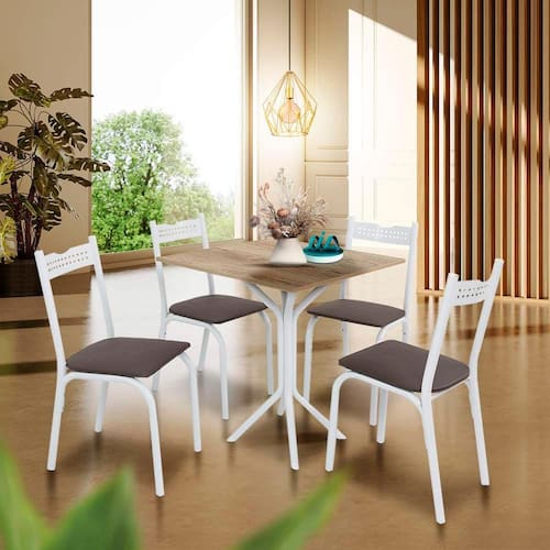 Este conjunto inclui uma mesa e quatro cadeiras, todos com estrutura e pés em aço carbono High-Steel, garantindo resistência e proteção contra ferrugem. As cadeiras possuem assentos de madeira com revestimento em corino sintético e sapatas nos pés para proteger tanto o produto quanto o piso de riscos, suportando até 100 kg cada. A mesa apresenta tampo em MDP BP, ideal para refeições em família ou encontros sociais.