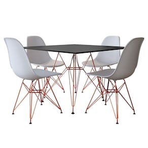 Mesa De Jantar Eames Eiffel Quadrada Preta 90cm Com 4 Cadeiras Brancas Base Ferro CobreO Jogo de Mesa 4 Cadeiras Eames Eiffel se destaca pelo design moderno e sofisticado. A Cadeira Eames Eiffel é confeccionada em polipropileno, sua base é em ferro, o que confere total resistência e conforto. O Jogo de Mesa 4 Cadeiras Eames Eiffel da vida ao ambiente além de combinar com todos os tipos e cores de móveis.CARACTERISTICASTipo: ConjuntoModelo: EiffelFerro: CobreDIMENSÕES DO PRODUTOCadeiraCor: BrancoAltura: 85 cmLargura: 47 cmProfundidade: 50 cmAssento x Chão: 45 cmContém: 04 cadeirasMesa:Cor: PretoAltura: 76 cmLargura: 90 cmProfundidade: 90 cmObs: Imagens Meramente IlustrativaMesa de Jantar Eames Eiffel Quadrada Preta 90cm com 4 Cadeiras Brancas Base Ferro Cobre