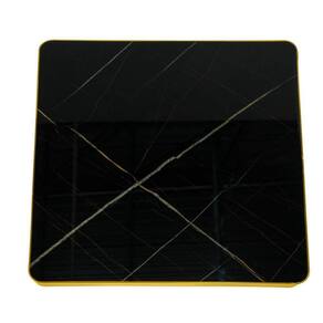 O design minimalista e ao mesmo tempo imponente combina a delicadeza do mármore sintético com veios acinzentados ao contraste marcante da base preta, criando uma estética moderna e versátil. As bordas douradas adicionam brilho e sofisticação, tornando a mesa um verdadeiro destaque decorativo.