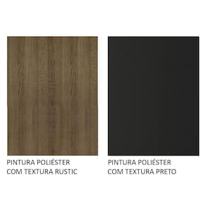 O acabamento combina os tons preto e amadeirado Rustic. É feito em Pintura Poliéster de alta resistência, processo que aumenta a qualidade e durabilidade do móvel, protegendo contra os efeitos da água e do calor.