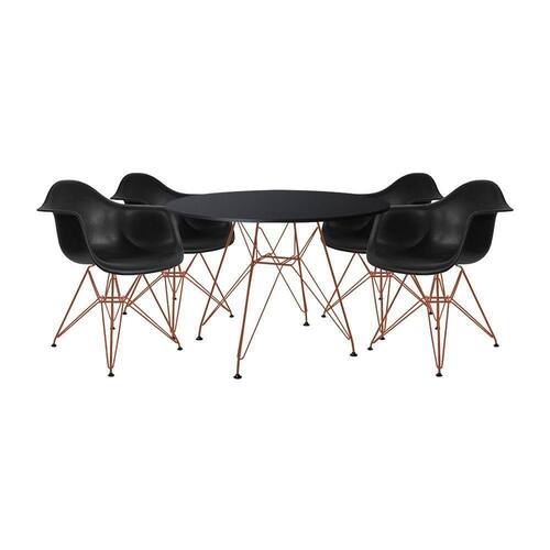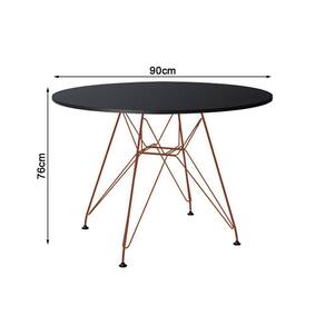 Mesa De Jantar Redonda Eames Eiffel 90cm Preta Com 4 Poltronas Pretas Ferro CobreO Conjunto de Mesa Eames Eiffel e Poltrona Daw se destaca pelo design moderno e sofisticado. Com base em ferro que confere total resistência, garantindo melhor durabilidade, sendo uma ótima escolha para quem busca conforto e design único.Tipo: ConjuntoModelo: DawCor do Tampo: PretoCor do Assento: PretoCARACTERÍSTICASAssento: PolipropilenoTampo: PretoBase: FerroGarantia: 90 DiasDIMENSÕES DA POLTRONAAltura: 80cmAssento até o chão: 40cmBraço do assento até o chão: 65cmLargura: 38cmComprimento: 38cmSuporta até: 120kgDIMENSÕES DA MESAAltura: 76cmDiâmetro: 90cmRECOMENDAÇÕESLimpeza: Utilize um pano macio levemente úmido.Necessita montagem.ATENÇÃOAS IMAGENS SÃO MERAMENTE ILUSTRATIVAS E PODEM SOFRER VARIAÇÕES DE COR E PEQUENOS DETALHES DE ACORDO COM O SEU MONITOR, ILUMINAÇÃO DO AMBIENTE E ATÉ MESMO A SUA PERCEPÇÃO VISUAL.Mesa de Jantar Redonda Eames Eiffel 90cm Preta com 4 Poltronas Pretas Ferro Cobre