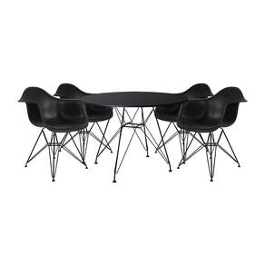 Mesa De Jantar Redonda Eames Eiffel 90cm Preta Com 4 Poltronas Pretas Ferro Preto O Conjunto de Mesa Eames Eiffel e Poltrona Daw se destaca pelo design moderno e sofisticado. Com base em ferro que confere total resistência, garantindo melhor durabilidade, sendo uma ótima escolha para quem busca conforto e design único.Tipo: ConjuntoModelo: DawCor do Tampo: PretoCor do Assento: PretoCARACTERÍSTICASAssento: PolipropilenoTampo: PretoBase: FerroGarantia: 90 DiasDIMENSÕES DA POLTRONAAltura: 80cmAssento até o chão: 40cmBraço do assento até o chão: 65cmLargura: 38cmComprimento: 38cmSuporta até: 120kgDIMENSÕES DA MESAAltura: 76cmDiâmetro: 90cmRECOMENDAÇÕESLimpeza: Utilize um pano macio levemente úmido.Necessita montagem.ATENÇÃOAS IMAGENS SÃO MERAMENTE ILUSTRATIVAS E PODEM SOFRER VARIAÇÕES DE COR E PEQUENOS DETALHES DE ACORDO COM O SEU MONITOR, ILUMINAÇÃO DO AMBIENTE E ATÉ MESMO A SUA PERCEPÇÃO VISUAL.Mesa de Jantar Redonda Eames Eiffel 90cm Preta com 4 Poltronas Pretas Ferro Preto