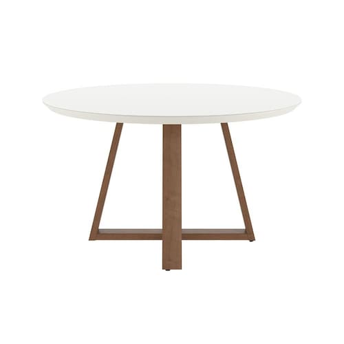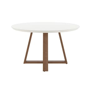 A mesa de jantar Bennett combina um tampo redondo em MDF com vidro aplicado e pés de madeira maciça em formato cruzado, oferecendo um visual sofisticado e atemporal. Ideal para salas de jantar, áreas gourmet e espaços integrados, ela é perfeita para refeições familiares, jantares elegantes e encontros casuais.