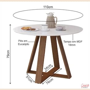 ESPECIFICAÇÕES TÉCNICA • Altura: 79 cm • Diâmetro: 110 cm • Base: Madeira maciça (eucalipto) • Tampo: MDF 18mm