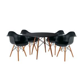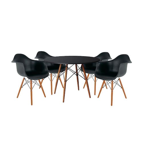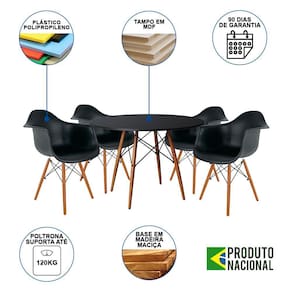 Mesa De Jantar Redonda Eiffel Eames Em Madeira 90cm Preta Com 4 Poltronas PretasO Conjunto de Mesa Eames Eiffel e Poltrona Daw se destaca pelo design moderno e sofisticado. Com base em madeira maciça que confere total resistência, garantindo melhor durabilidade, sendo uma ótima escolha para quem busca conforto e design único.Tipo: ConjuntoModelo: DawCor do Tampo: PretoCor do Assento: PretoCARACTERÍSTICASAssento: PolipropilenoTampo: PretoBase: Madeira MaciçaGarantia: 90 DiasDIMENSÕES DA POLTRONAAltura: 80cmAssento até o chão: 40cmBraço do assento até o chão: 65cmLargura: 38cmComprimento: 38cmSuporta até: 120kgDIMENSÕES DA MESAAltura: 76cmDiâmetro: 90cmRECOMENDAÇÕESLimpeza: Utilize um pano macio levemente úmido.Necessita montagem.ATENÇÃOAS IMAGENS SÃO MERAMENTE ILUSTRATIVAS E PODEM SOFRER VARIAÇÕES DE COR E PEQUENOS DETALHES DE ACORDO COM O SEU MONITOR, ILUMINAÇÃO DO AMBIENTE E ATÉ MESMO A SUA PERCEPÇÃO VISUAL.