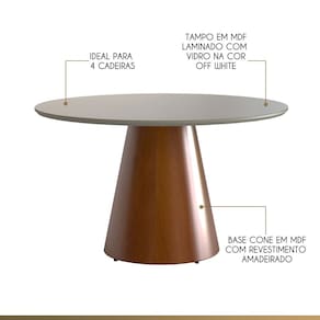 CARACTERÍSTICAS TÉCNICAS: - Base Cone Produzida em MDF com Revestimento Amadeirado - Tampo Produzido em MDF Laminado com Vidro 4mm na Cor Off White - Produto Entregue Semi Montado *Ideal para 4 Cadeiras