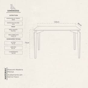 Acabamento: Verniz fosco Acabamento: Verniz Acabamento da Base: Verniz Acabamento do Tampo: Verniz Ambiente Principal: Sala de Jantar Atóxico: Sim codigo_ean: 7900288197320 Complexidade da Montagem: Baixa: pode ser montado por uma pessoa sozinha Cor: Mel Cor do Produto: Mel Design da Base: 4 Pés Dobrável: Não Escala de Brilho: Fosco Espessura do Tampo: 18 mm Extensível: Não Itens Inclusos: 1 Mesa e Kit Ferragens Linha ou Coleção: Aura Manual de Montagem e Instalação: https://product-hub-prd.madeiramadeira.com.br/487733523/documents/c66ed97e-ac92-42b8-afe6-9418eecc504f3083150491417530989736808.pdf Marca: Árvore de Minas Material da Base: Madeira Maciça Material do Tampo: MDF Material Principal: Madeira Maciça Medida da Base (A x L x P): 75 x 90 x 120 Medida da Mesa (A x L x P): 75 x 90 x 120 Medida do Tampo (L x C x E): 90 x 120 x 1,8 Necessita Montagem: Sim Origem do Produto: Nacional Peso: 37,4 kg Possui Portas: Não Possui prateleira: Não Possui Rodízio: Não Possui Suporte Giratório: Não Possui Vidro: Não Recomendações de Uso, Manutenção e Limpeza: Utilizar pano umido, não utilizar liquidos abrasivos Sistema de Montagem: Fixação de Parafusos Suporta Até (kg): 130 kg Tipo de Madeira Maciça: Tauari Tipo de Madeira Maciça da Base: Tauari