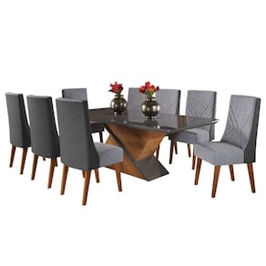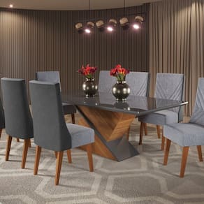 Para reunir a família naquele jantar especial, o Conjunto Cecilia e Topazio é a pedida certa! Enquanto a mesa tem base com design inovador, tampo chanfrado e canto arredondado e com aplicação de vidro, trazendo estilo à decoração, as 8 cadeiras têm estofamento em espuma e revestimento em tecido de toque macio, proporcionando mais conforto aos seus momentos de alegria Medida da Mesa (A x L x P): A:82 x L:200 x P:90cm Peso da Mesa: 77,5 kg Mesa suporta até: 50 kg Acabamento da Cadeira/Banco: Pintura UV Acabamento da Mesa: Pintura UV Acompanha Manual de Instalação: Sim Altura do Conjunto: 82 cm Ambiente Principal: Sala de Jantar Cadeira/Banco estofada: Encosto e Assento Estofados Cadeira/Banco suporta até: 90 kg Complexidade da Montagem: Média: pode ser montado por mais de uma pessoa e/ou necessite de maior conhecimento para montagem Cor: Mel/Grafite/ Linho Inox/Cinza Cor do Produto: Mel/Grafite/ Linho Inox/Cinza Cor do Tampo: Grafite Cor Secundária: Cinza De Canto (Canto Alemão): Não Enchimento do Assento: Espuma D-20 Enchimento do Encosto: Espuma D-20 Escala de Brilho: Semi-Brilho Espessura do Tampo: 40 mm Espessura do Vidro: mm Estrutura do Assento: MADEIRA DE EUCALIPTO/MDF Estrutura do Encosto: MDF/MADEIRA MACIÇA Formato do Tampo: Retangular Informações Complementares: Sala de Jantar 8 lugares Itens Inclusos: 1 mesa, 8 cadeiras, kit ferragem, manual de montagem Manual de Montagem e Instalação: https://product-hub-prd.madeiramadeira.com.br/932649/documents/ee154c23-137b-4632-8fab-d31458f0b835227014452817248643415765.pdf Material da Base da Mesa: MDP Material da Estrutura da Cadeira: MDF/Madeira Maciça Material do Tampo: Vidro/MDF Material Principal das Cadeiras/Bancos: Madeira Maciça Medida da Cadeira/Banco (A x L x P): A:99 x L:45 x P:68cm Medida do Tampo (L x C x E): L:200 x C:90 x E:4,0cm Mesa Extensível: Não Necessita Montagem: Sim Origem do Produto: Nacional Peso da Cadeira/Banco: 8,85 kg Possui Apoio Para os Pés: Não Possui Vidro: Sim Quantidade de Cadeiras: 8 Quantidade de Lugares: 08 Recomendações de Uso, Manutenção e Limpeza: Limpar com pano levemente umedecido com água Revestimento da Cadeira/Banco: Linho Sistema de Montagem: Parafusos, cavilhas