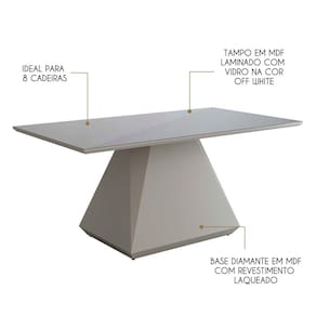 CARACTERÍSTICAS TÉCNICAS: - Base Diamante Produzida em MDF com Revestimento Laqueado - Tampo Produzido em MDF Laminado com Vidro 4mm na Cor Off White - Tampo com Detalhe Chanfrado - Produto Entregue Semi Montado *Ideal para 8 Cadeiras