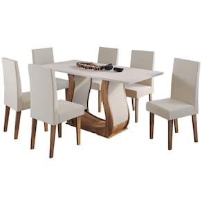 Mesas são indispensáveis para o funcionamento da casa e é no cômodo de confraternização que elas ganham protagonismo. Composto por peças de muito charme, o Conjunto Emmy e Venus torna o uso desse móvel importante com 6 cadeiras para garantir uma usabilidade plena para o seu dia a dia Medida da Mesa (A x L x P): A:79,4 x L:160 x P:80cm Peso da Mesa: 41.8 Mesa suporta até: 50 Acabamento da Cadeira/Banco: Pintura UV Acabamento da Mesa: Pintura UV Acompanha Manual de Instalação: Sim Ambiente Principal: Sala de Jantar Cadeira/Banco estofada: Encosto e Assento Estofados Cadeira/Banco suporta até: 90 Complexidade da Montagem: Média: pode ser montado por mais de uma pessoa e/ou necessite de maior conhecimento para montagem Cor: Imbuia/Blonde/Pastel Cor do Produto: Imbuia/Blonde/Pastel Cor Secundária: Bege De Canto (Canto Alemão): Não Enchimento do Assento: Espuma D-20 Enchimento do Encosto: Espuma D-12 Escala de Brilho: Semi-Brilho Espessura do Tampo: 25 Estrutura do Assento: MDP/ESPUMA Estrutura do Encosto: MDF/ESPUMA Formato do Tampo: Retangular Informações Complementares: Sala de Jantar 6 lugares Itens Inclusos: 1 Mesa, 6 Cadeiras, Kit Ferragem, Manual de Montagem Manual de Montagem e Instalação: https://cdn2.madeiramadeira.com.br/atributo/viero-moveis/1684895-base-verona-com-cad-venus.pdf Material da Base da Mesa: MDF/MDP Material da Estrutura da Cadeira: MDF/MDP Material do Tampo: MDP Material Principal das Cadeiras/Bancos: MDF/MDP Medida da Cadeira/Banco (A x L x P): A:98,5 x L:41 x P:58,5cm Medida do Tampo (L x C x E): L:160 x P:80 x E:2,5cm Mesa Extensível: Não Necessita Montagem: Sim Origem do Produto: Nacional Peso da Cadeira/Banco: 7.1 Possui Apoio Para os Pés: Não Possui Vidro: Não Quantidade de Cadeiras: 6 Quantidade de Lugares: 06 Recomendações de Uso, Manutenção e Limpeza: Limpar com pano levemente umedecido com água Revestimento da Cadeira/Banco: Veludo Sistema de Montagem: Parafusos, cavilhas