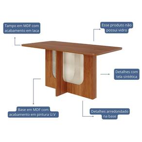 ESPECIFICAÇÕES: Estrutura em MDF Pintura UV Tampo em MDF 25mm com cantos arredondados e bordas chanfradas com acabamento laca Base em MDF com detalhe em tela sintética e fixação oculta (sem parafusos aparentes) Formato da base proporciona encaixe das cadeiras e otimização do espaço Acomoda 6 lugares