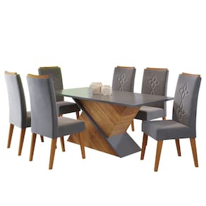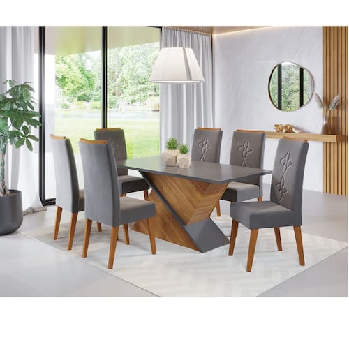 Mesa de Jantar Retangular Patagonia Com 6 Cadeiras Flora em Madeira Maciça Cobre/Cinza Brilho/Grafite - Casa Giulia