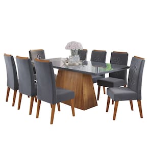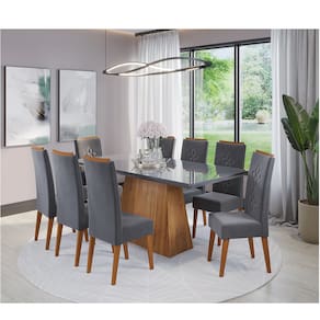- Categoria: Mesa de Jantar 8 Lugares - Vidro Temperado: Sim - Possui Vidro: Sim - Material do Tampo: Vidro/MDF - Peso Suportado no Tampo: 50 kg - Peso Suportado: 90 kg - Revestimento/Acabamento: Pintura UV - Quantidade de Pés: 32 - Garantia (dias): 90 Dias - Recomendação de Manutenção: Utilizar pano levemente umedecido, seguido de pano seco. Não utilizar quaisquer produtos abrasivos. - Observação: Objetos decorativos que aparecem nas imagens, não acompanham o produto. A capacidade de carga considera que o peso está distribuído igualmente pela peça. As cores das imagens podem variar de acordo com as configurações do seu monitor e/ou da iluminação do ambiente onde o produto está inserido. As imagens indicam uma sugestão - Indicação de Uso: Sala de Jantar - Acompanha: KIT FERRAGEM E MANUAL DE MONTAGEM - Pode Ser Montado Invertido?: Não - Sistema de Montagem: Parafusos, cavilhas, cola e minifix. - Grau de Dificuldade de Montagem: Médio - Necessita de Montagem: Sim - Como os Móveis Chegarão em Minha Casa?: Desmontado em caixas, acompanhado de todas as peças, ferragens e manuais para montagem. - Possui Borda de PVC nas Bordas?: Não - Quantidade de Sapatas: 36 - Pés com regulagem de altura?: Não - Possui Pés?: Sim - Possui Sapatas?: Sim - Possui Rodízios?: Não - Espessura do Tampo (mm): 40 mm - Material do Tampo: Vidro e MDF - Possui Tampo?: Sim - Escala de Brilho: Semi-Brilho - Tecido da Cadeira: VELUDO - Cadeira Estofada: Sim - Material do Encosto: Mdf, Espuma, Madeira - Medidas da Cadeira ( A x L x P ): A:98,5 x L:41 x XP:61cm - Possui Puxadores?: Não - Material do Assento: Espuma e Madeira - Altura do Chão até o Assento (cm): 375 - Quantidade de cadeiras por conjunto: 8 - Densidade do Encosto: D-20 - Densidade do Assento: D-20 - Acompanha Cadeiras: Sim - Possui Prateleiras?: Não - Quantidade de Lugares: 8 Lugares - Formato da Mesa: Retangular - Possui Espelho?: Não - Possui Portas?: Não - Possui Gavetas?: Não - Espessura da Estrutura: 15 mm e 40 mm - Material da Estrutura: Mdp, Mdf, Eucalipto