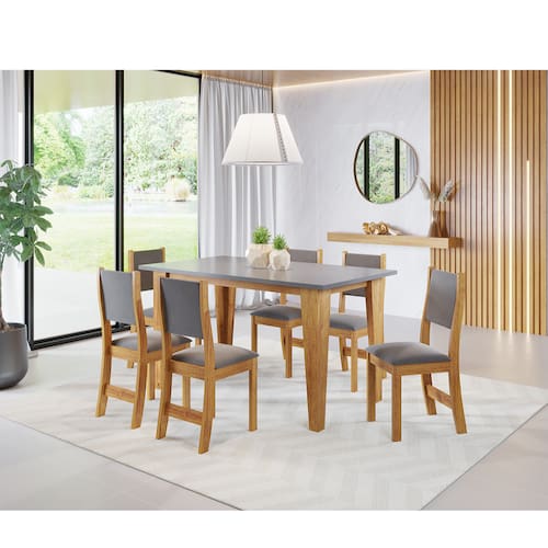 - Material do Tampo: MDP - Necessita de Montagem: Sim - Possui Borda de PVC nas Bordas?: Não - Pés com regulagem de altura?: Não - Categoria: Mesa de Jantar 6 Lugares - Vidro Temperado: Não - Possui Vidro: Não - Peso Suportado no Tampo: 50 kg - Peso Suportado: 80 kg - Revestimento/Acabamento: Pintura UV - Quantidade de Pés: 24 - Garantia (dias): 90 Dias - Recomendação de Manutenção: Utilizar pano levemente umedecido, seguido de pano seco. Não utilizar quaisquer produtos abrasivos. - Observação: Objetos decorativos que aparecem nas imagens, não acompanham o produto. A capacidade de carga considera que o peso está distribuído igualmente pela peça. As cores das imagens podem variar de acordo com as configurações do seu monitor e/ou da iluminação do ambiente onde o produto está inserido. As imagens indicam uma sugestão - Indicação de Uso: Sala de Jantar - Acompanha: KIT FERRAGEM E MANUAL DE MONTAGEM - Pode Ser Montado Invertido?: Não - Sistema de Montagem: Parafusos, cavilhas, cola e minifix. - Grau de Dificuldade de Montagem: Médio - Como os Móveis Chegarão em Minha Casa?: Desmontado em caixas, acompanhado de todas as peças, ferragens e manuais para montagem. - Quantidade de Sapatas: 32 - Possui Pés?: Sim - Possui Sapatas?: Sim - Possui Rodízios?: Não - Espessura do Tampo (mm): 25 mm - Material do Tampo: MDP - Possui Tampo?: Sim - Escala de Brilho: Semi-Brilho - Tecido da Cadeira: VELUDO - Cadeira Estofada: Sim - Material do Encosto: Mdp e Espuma - Medidas da Cadeira ( A x L x P ): A:89 x L:36,6 x P:51,5cm - Possui Puxadores?: Não - Material do Assento: Mdp e Espuma - Altura do Chão até o Assento (cm): 46 - Quantidade de cadeiras por conjunto: 6 - Densidade do Encosto: D-12 - Densidade do Assento: D-16 - Acompanha Cadeiras: Sim - Possui Prateleiras?: Não - Quantidade de Lugares: 6 Lugares - Formato da Mesa: Retangular - Possui Espelho?: Não - Possui Portas?: Não - Possui Gavetas?: Não - Espessura da Estrutura: 25 mm - Material da Estrutura: Mdp e Mdf