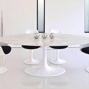 Mesa de jantar Saarinen Oval, Tampo 120x80 cm em Mármore Carrara, com contra tampo em MDF 25 mm, Base em alumínio fundido com pintura automotiva PU.