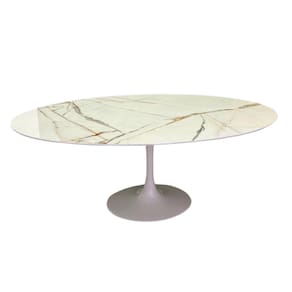 Mesa de Jantar Saarinen Oval, Tampo em Mdf Calacata, com contra tampo em MDF, Base em alumínio fundido com pintura automotiva PU.