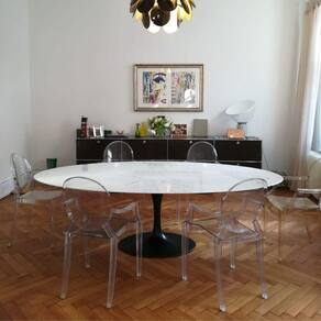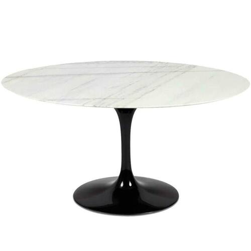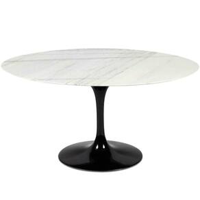 Mesa de jantar Saarinen Oval, Tampo 180x100 cm em Mármore, com contra tampo em MDF 25 mm, Base em alumínio fundido com pintura automotiva PU.