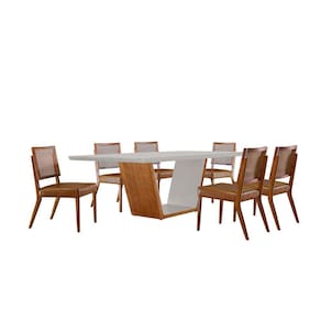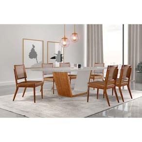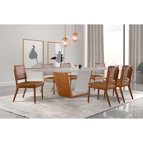 Mesa de lâmina de madeira cinamomo com detalhe laqueado, tampo laqueado e vidro serigrafado off white temperado. Cadeira de madeira maciça tauari, com assento em espuma D26 revestido em tecido courino e encosto em tela sintética. Medida da Mesa (A x L x P): 80 x 180 x 90 Peso da Mesa: 79 kg Mesa suporta até: 80.0000 Acabamento da Cadeira/Banco: Pintura Acabamento da Mesa: Verniz Acompanha Manual de Instalação: Não Almofada do assento: Fixa Almofada do encosto: Não Possui Altura do Conjunto: 96 Ambiente Principal: Sala de Jantar Apoio para Braços Estofado: Não Cadeira/Banco estofada: Somente Assento Estofado Cadeira/Banco Estofada: Somente Assento Estofado Cadeira/Banco suporta até: 120.0000 codigo_ean: 7909903373323 Complexidade da Montagem: Média: pode ser montado por mais de uma pessoa e/ou necessite de maior conhecimento para montagem Cor: Cinamomo Imbuia/Off White Cor do Produto: Cinamomo Imbuia/Off White Cor Flex: Não De Canto (Canto Alemão): Não Design da Base: Em V Enchimento do Assento: Espuma D-26 Enchimento do Encosto: Espuma D-18 Escala de Brilho: Fosco Espessura do Tampo: 44 mm Formato do Tampo: Retangular Informações Complementares: Conjunto com um designer super moderno com muita qualidade e conforto Itens Inclusos: 1 Mesa, 6 Cadeiras, Kit Ferragens e Manual de Montagem Linha ou Coleção: Medelim/Veneza Manual de Montagem e Instalação: https://product-hub-prd.madeiramadeira.com.br/861064/documents/f406e8c1-774e-4364-91e9-e0e06fcf3b1b2817737011manualdemontagem.pdf Material da Base da Mesa: Madeira Maciça Material da Estrutura da Cadeira: Madeira Maciça Material do Tampo: Madeira Maciça Material Principal das Cadeiras/Bancos: Madeira Maciça Medida da Base (A x L x P): 78 x 116 x 44 Medida da Cadeira/Banco (A x L x P): 96 x 59 x 47,5 Medida do Canto Alemão (A x L x P): Não possui Medida do Suporte Giratório (L x C x E): Não possui Medida do Tampo (L x C x E): 180 x 90 x 4 Mesa Dobrável: Não Mesa Extensível: Não Montagem Flex: Não Necessita Montagem: Sim Origem do Produto: Nacional Peso da Cadeira/Banco: 8,6 kg Possui Apoio para Braços: Não Possui Apoio Para os Pés: Não Possui Prateleiras: Não Possui Suporte Giratório: Não Possui Vidro: Sim Quantidade de Cadeiras: 6 Quantidade de Lugares: 06 Recomendações de Uso, Manutenção e Limpeza: Limpar com pano seco Revestimento da Cadeira/Banco: Courino Sistema de Montagem: Parafusos Tipo de Assento: Fixo Tipo de Encosto: Fixo Tipo de Madeira Maciça da Base da Mesa: Tauari Tipo de Madeira Maciça do Tampo: Tauari Vidro Temperado: Sim