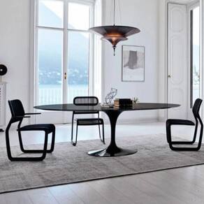 Mesa de jantar Saarinen Oval, Tampo MDF 18 mm, com contra tampo em MDF 18 mm, Base em alumínio fundido com pintura automotiva PU.
