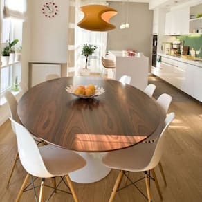 Mesa de Jantar Saarinen Oval, Tampo em MDF Laminado em Madeira, com contra tampo em MDF, Base em alumínio fundido com pintura automotiva PU.