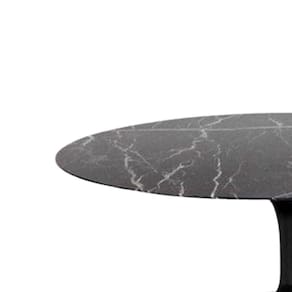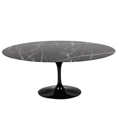 Mesa de Jantar Saarinen Oval, Tampo 198x122 cm em Mármore Nero, com contra tampo em MDF, Base em alumínio fundido com pintura automotiva PU.
