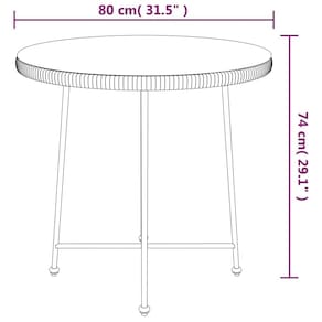 - Cor: preto- - Forma: redonda- - Material: vidro temperado sintético- - Interno/externo: interno/externo- - Capa incluída: Não- - Sala: jardim e terraço- - Capacidade: contém bebidas, lanches e decorações- - Dimensões: 31,5 x 31,5 x 29,1 polegadas (L x C x A) - - Altura da superfície: 0,2 pol. - Altura da perna: 29,1 polegadas- - Peso: 21,5 libras- - Marca: vidaXL- - A entrega contém: mesa, manual de montagem- - Montagem necessária: Sim- - SKU: 319436- - EAN: 8720845557942-