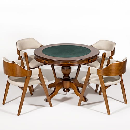 Se você procura algo versátil que compõe vários tipos de ambientes, o Kit Mesa de Jogos Redonda 140cm New Orleans com 04 Cadeiras Estofadas Suran M04 Imbuia da Lyam Decor é perfeito para sua casa. Sendo capaz de compor muito bem o ambiente, são produzidos com materiais de excelente qualidade e resistência. Possui estrutura em madeira maciça, na cor imbuia agregando elegância e praticidade ao ambiente. Você e seu lar merecem, adquira já o seu!!