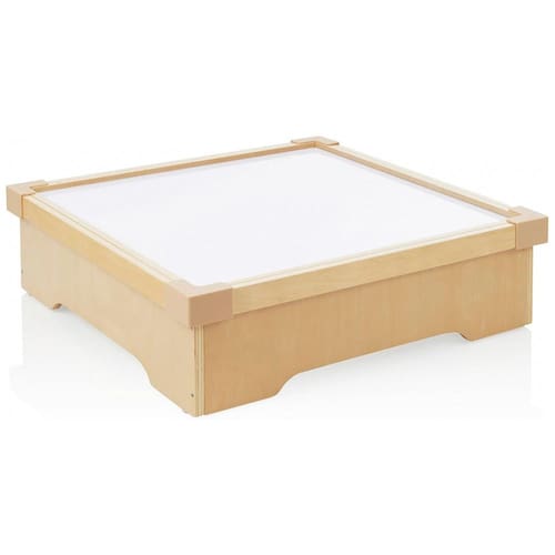 A estrutura utiliza um aro em madeira (plywood) com bordas plásticas protetoras, abrigando um painel LED interno que distribui a luz de forma homogênea e com baixo consumo de energia. O equipamento chega totalmente montado e mede aproximadamente 58cm x 58cm x 18cm, com superfície iluminada quadrada e altura que permite o acesso confortável de crianças sentadas em cadeiras infantis ou no chão.?