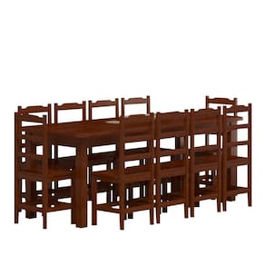 Este conjunto de mesa com cadeiras apresenta uma mesa robusta com estrutura e pés em madeira maciça, combinada com um tampo em MDP. As cadeiras são feitas de 100% madeira maciça, entregues montadas para maior comodidade, e cada uma suporta até 150kg. O design clássico e resistente torna-o ideal para diversas configurações de refeições.