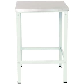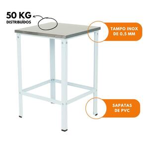 Mesa Leve com tampo em aço inox espessura 0,50mm, quadro superior em aço carbono, desmontável e sapatas em PVC.