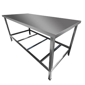 Essa mesa de bancada possui pés e travessas em aço carbono com espessura 0,9cm. Seus pés contam com acabamento de plástico, para que a mesa inox não se mova durante a sua utilização.