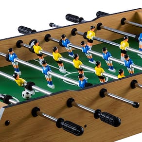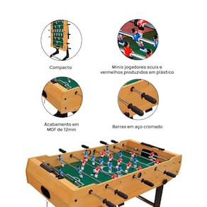 Mesa de futebol Dobrável, confeccionada em MDF é muito resistente, durável e com acabamento em madeira natural de 12mm. Barras em aço cromado de 12,7mm que garante rolagem deslizante. Minis jogadores azuis e vermelhos produzidos em plástico. Prática ocupa espaço mínimo e pode ser dobrada. Diversão e praticidade garantidas!