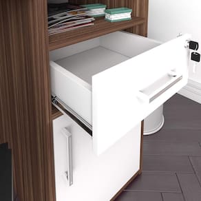 Contém uma gaveta com corrediças telescópicas possibilitando a abertura total da gaveta com deslizamento suave, preciso e resistente, contando com uma chave trazendo e privacidade.