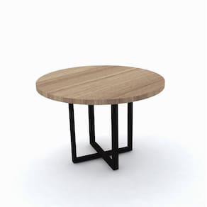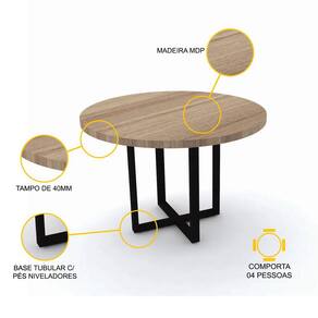 - Mesa de reunião redonda, com tampo em madeira (MDP) e base tubular com pés niveladores.