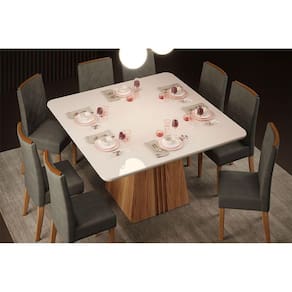 Mesa de Sala Jantar Itália + Tampo Madeirado Vidro Curvo 136x136cm Freijó/Off White - DJ Móveis
