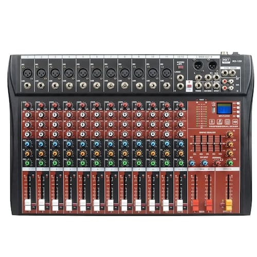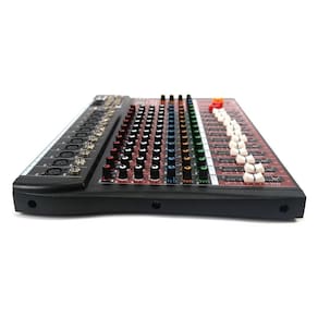 Mesa de som 12 canais com eq/efx/usb/bluetooth Principais características - 11 entradas linha p10 e mcrofone xlr - 2 entradas estéreo - saídas master balanceadas p10 e xlr - saídas aux send, send return, phones - ctrl room p10 - tape in/out , rca - gain, hf, mf, lf, aux, fx, pan, pfl por canal. - equalizador 5 bandas - +48v Usb player e bluetooth Características: 12 canais Efeitos dsp integrados Saída balanceada Equalizador 5 bandas Mp3 player Bluetooth Bivolt Acompanha fonte 100-240vac modelo - ey-08 Seção do canal de entrada Entrada de microfone Entradas de microfone aceitam um conector macho padrão xlr. 1. Terra, 2; sinal, 3. Terra . Você pode usar no máximo 2-60db de acordo com o nível do sinal pelo controle gain. Entrada de linha Usando um conector de linha p10, você pode usar desbalanceado. Conecte a este com teclados ou outros instrumentos elétricos. Controle de ganho Ajusta a sensibilidade de entrada de -60db a - 20db com -20db na posição out e - 40db para odb. Controle de equalização de alta frequência Fornece + 15db de equalização de frequência fixa que atinge 12khz. Controle de equalização de frequência média Fornece + 15db de equalização de frequência fixa que atinge 0 a 3,5khz. Controle de equalização de baixa frequência Fornece + 15db de equalização de frequência fixa que atinge a 100 hz. Controle aux Use este controle para definir o nível do sinal da fonte estéreo externa e o controle do sinal principal é recontrolado pela seção mestre. Homologação Anatel: 079902113999