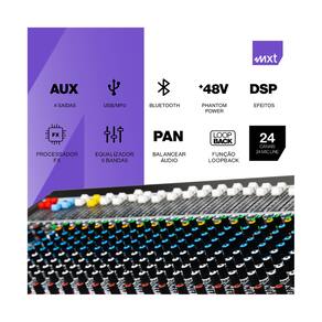 Modelo: MXT MX-24.4 Entradas: 24 canais com entradas XLR e Line balanceadas Equalização: Gráfico de 7 bandas Efeitos: Processador digital integrado Conectividade: Bluetooth, USB para gravação e reprodução Dimensões: 90x55x23 cm