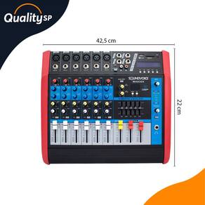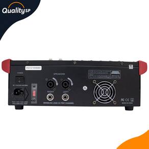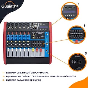 Especificações Técnicas: • 6 canais mono com entradas balanceadas XLR de linha P-10 • Equalização de 2 vias (grave e agudo) por canal • Possui efeitos de 24 bits • 16 Efeitos • Processador de efeitos com tela de LCD • Equalizador gráfico de 5 bandas • 1 auxiliar send/ efeitos • Entrada USB/SD com display digital • Gravação e reprodução direta em USB • Função Bluetooth • Leds indicadores de pico • Duas saídas SPEAKON • Bivolt (com chave seletora)