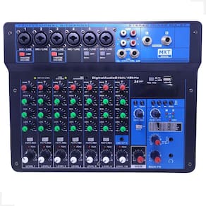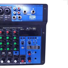 - Mixer analógico combinado com placa de som digital- Entrada de 3v separa para microfone condensador de 3,5mm (p2)- Fonte de alimentação Phanton Power (48v) para microfone condensador nas 4 entrada mic-line 1-4- Entradas: MIC*6; 2 RCA; PC; LINE; USB; BT; 3,5mini- Saídas: STEREO OUT; PHONES; 3,5MINI- 6 Entradas Combo de microfone em combinação XLR e P10- 1 Entrada Line RCA Stereo e 1 entrada Stereo- Taxa de amostragem de áudio: 24 bits/48 kHz- Chip ARM de alta velocidade integrado com tecnologia de processamento exclusivas- DSP 24 efeitos pre programados- Incorpora baixo ruído, mudança de voz, mudança de tom, reverberação, atraso, efeitos de som elétrico, etc- Função LOOPBACK flexível, perfeita para gravação e webcast- Gravação e reprodução de alta resolução em duas trilhas- Vários grupos de gravação são opcionais e o modo de monitor duplo é opcional- Várias interfaces combinadas de entrada/saída, vários métodos de gravação estão disponíveis- Modo de entrada de energia altamente utilizável e com chave power- Equalizador de 3 Bandas com alta qualidade com graves, médios e agudos- Filtro passa-altas: HPF 80Hz em dois canais- Status visual do nível de gravação elétrico, conveniente para ajuste a qualquer momento- Tecnologia BT para conectar seu Smartphone- Gravação direta no Pendrive- Gravação direta no PC- Interface para PC- Monitoração fone de ouvido- Módulo MP3, pendrive e interface USB- Visor Display: mostra a operação e status de reprodução- Fonte de alimentação automática (AC100-240V), saída 5V/2A- Chave Power On/OfConteúdo da Embalagem:- 01 Mesa Mxt MX-8T- 01 Fonte
