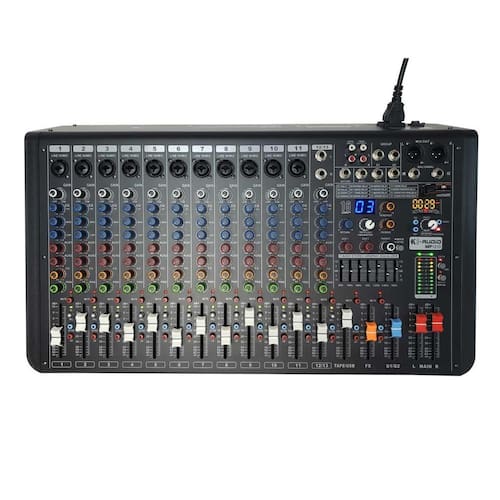 Mesa de som k-audio mp1210 12 canais - mixer analógicos de alto desempenho com efeitos integrados equalizador paramétrico de 3 bandas low - grave 100hz / mid - médios / 1khz / high - agudo 10khz ajuste do pré amplicador por canal gain 2 saídas trs aux send 1 saída dedicada para máquina de efeito por canal máquina de efeitos composto por 16 preset e ajustes controle de pan por canal left / right mute e controle de volume por fader de 60mm 48v power botão de acionamento do 48v divididos por grupo entradas tipo rca com controle de volume por fader 60mm 2 buses de grupo saídas tipo rca para gravação -equalizador gráco de 7 bandas para ajuste da saída master ou subgrupos saída xlr main out -saída trs main out vu saída meterbridge standard saída trs dedicada ao uso de fones de ouvido porta usb 2.0 para conexão de pendrive com áudios em mp3 conexão bluetooth para reprodução através de equipamento portátil Homologação Anatel: 007892012769 Marca: Não Informado